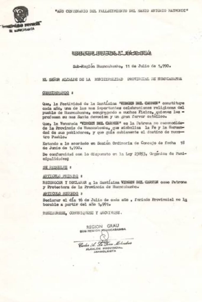 Siendo una de las mejores fiestas religiosas y costumbristas de Huancabamba, por Resolución Municipal N° 166-90-MPH/A., del 11 de junio de 1990, se resuelve en su artículo 1° “Reconocer y declarar a la Santísima Virgen del Carmen como patrona y protectora de la Provincia de Huancabamba”. Articulo 2° Declarar el día 16 de Julio de cada año, feriado provincial no laborable a partir del año 1991.