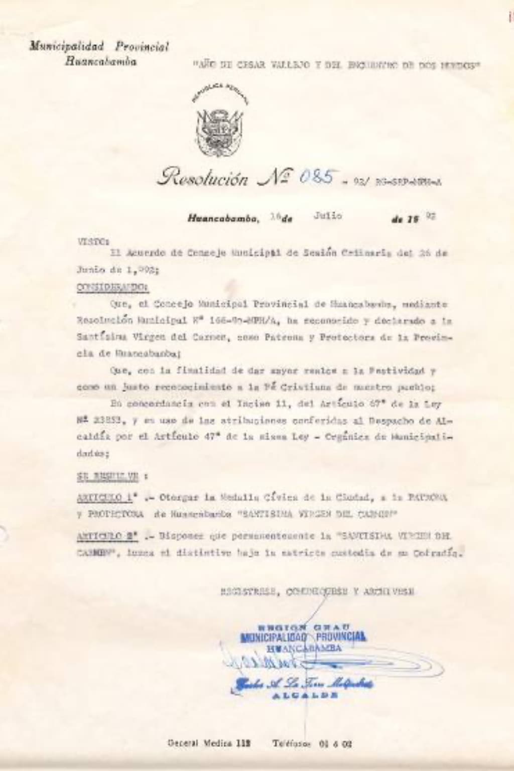 El 16 de julio de 1992, mediante Resolución N° 085-92/RG-SRP-MPH-A. Resuelve: Articulo 1° “Otorgar la medalla Cívica de la ciudad a la Patrona y Protectora de Huancabamba Santísima Virgen del Carmen. Articulo 2° Disponer que permanentemente la Santísima Virgen del Carmen, luzca el distintivo bajo la estricta custodia de su cofradía.