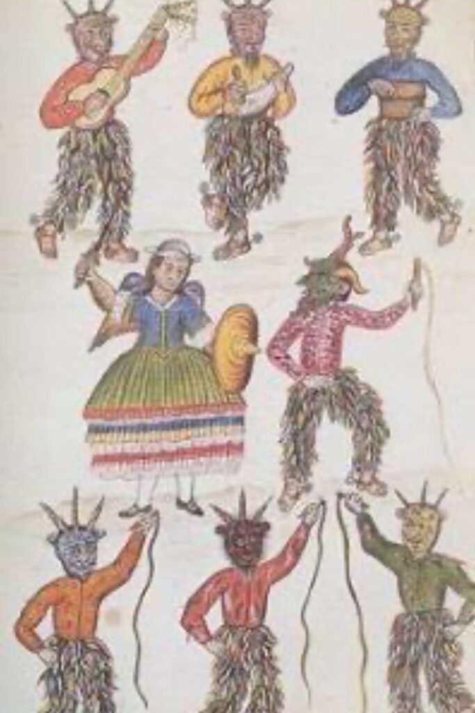 La lucha entre las fuerzas demoníacas nativas y las divinas de la doctrina católica se inicia en el proceso de la conquista. En 1872 ya recorría el Norte, la danza de los diablos bailándose en Piura, Lambayeque. Baltazar Martínez de Compañón, al viajar por estos pasajes, pudo observar la danza de los diablicos. ¿Qué determinó el cambio de nombre: diablo por “diablico”. En este siglo calzaban espuelas en los pies desnudos, su pantalón estaba adornado con lana de carnero que simulaban vellos, cubrían su tórax con camisa manga larga de color rojo adornada con listones de lana y círculos de tela, cubren sus caras con máscaras no indígenas que tienen nariz ancha, arrugas, ojos saltones y tres cachos. ¿ Representa la cara de un hacendado español ¿ vestimenta de los músicos es similar a diferencia que tienen barba (rala) tipo pera y la del diablo mayor o Capataz es una barba abundante con un solo cuerno; todos marchan provistos de un fuete elaborado de cuero de res; la música de los diablicos es negroide por el tipo de los instrumentos a cuyos compases bailan los danzantes, según lámina de Martínez un diablo tocaba una quijada de burro, otro una caja, y otro una guitarra, suponemos que van cantando y tocando tonadas especiales.
